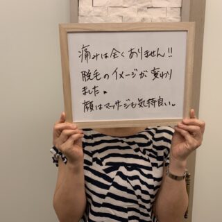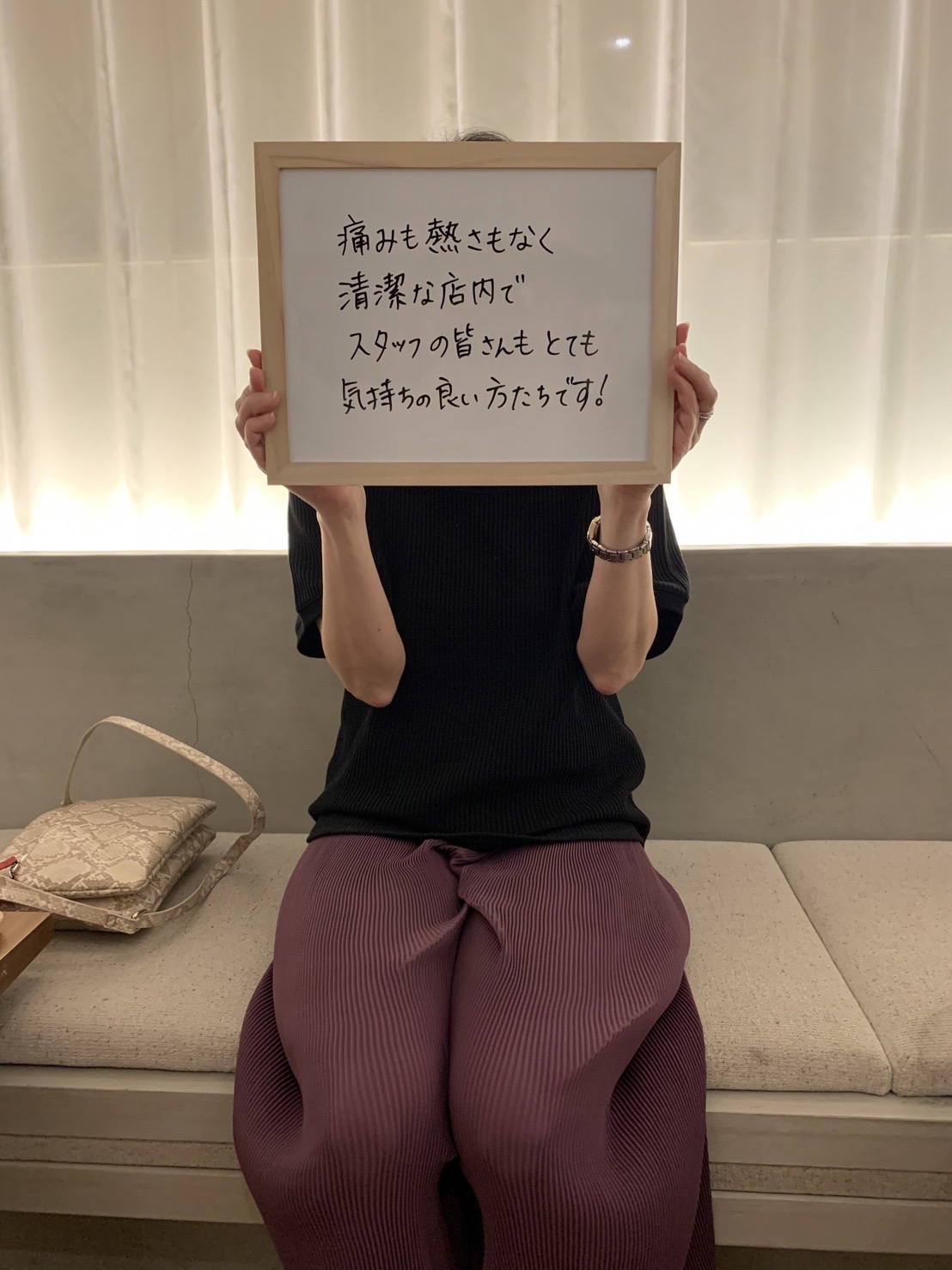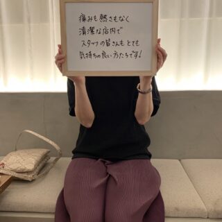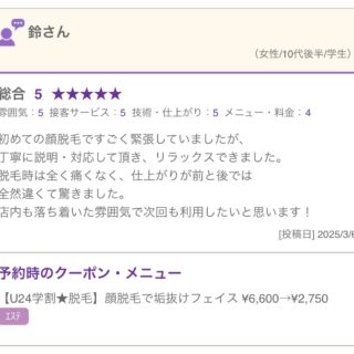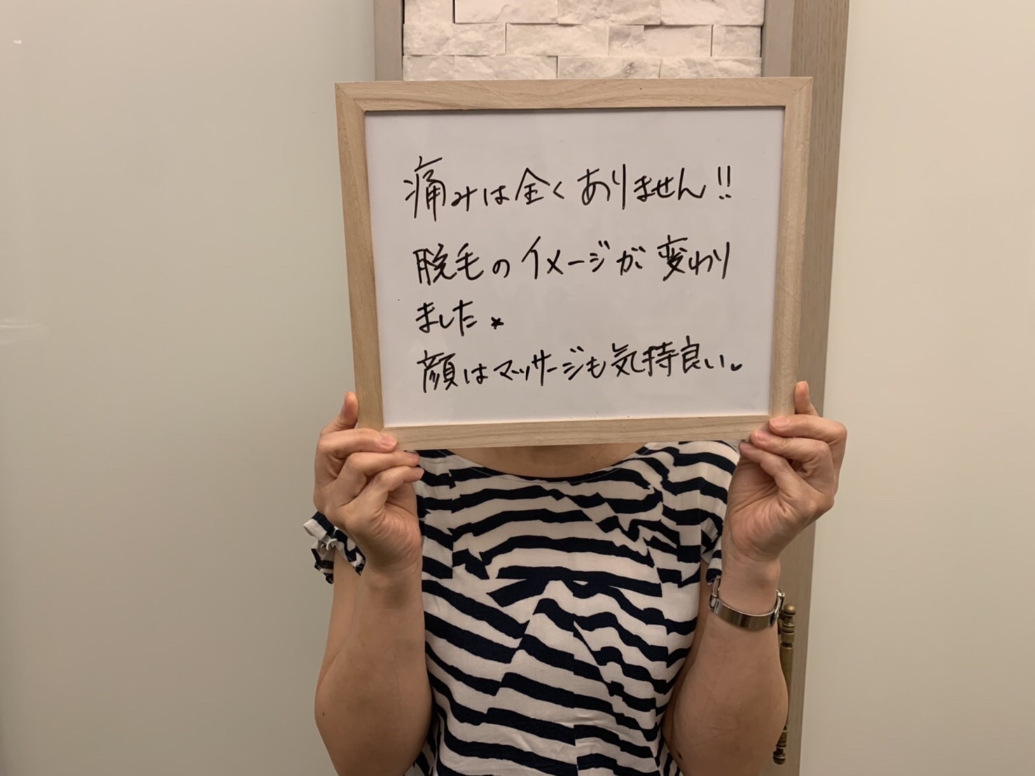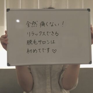 初めての顔脱毛ですごく緊張していましたが、丁寧に説明・対応して頂き、リラックスできました。 脱毛時は全く痛くなく、仕上がりが前と後では全然違くて驚きました。 店内も落ち着いた雰囲気で次回も利用したいと思います。