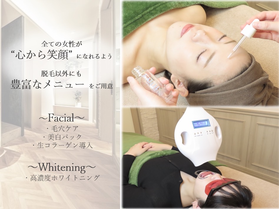Dione自由が丘では脱毛以外にもフェイシャルエステやホワイトニングなど様々なメニューをご予約頂けます。