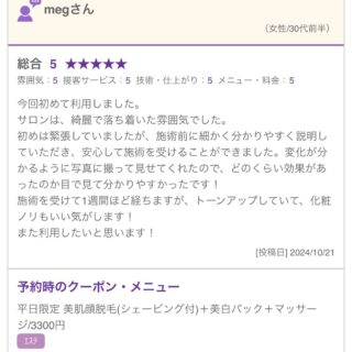 今回初めて利用しました。 サロンは、キレイで落ち着いた雰囲気でした。 初めは緊張していましたが、施術前に細かく分かりやすく説明していただき、安心して施術を受けることができました。変化が分かるように写真に撮って見せてくれたので、どのくらいの効...