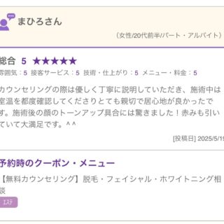 カウンセリングの際は優しく丁寧に説明していただき、施術中は室温を都度確認してくださりとても親切で居心地が良かったです。 施術の顔のトーンアップ具合には驚きました!赤みも引いて大満足です^^