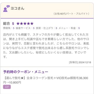 店内がとても綺麗で、スタッフの方々が優しく、担当してくれた方は聞き上手だし知識や話もでき素晴らしい方でした。 他のサロンは、拷問で、忍耐と言われましたが、こちらのサロンは、美肌になりながらエステ感覚で脱毛出来るから癒し系脱毛サロンでした。 ...